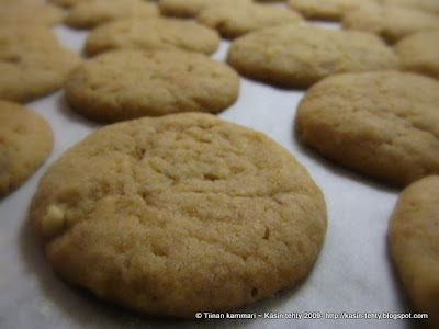 5. Tee taikinasta pari tankoa ja pätki paloiksi ( n.50-55 kpl ), pyöritä palloiksi ja laita leivinpaperin päälle pellille. Itse painelen palloja hieman littanaksi, mutta ne voi jättää myös palloiksi. Muista jättää leviämisvaraa kekseille! Paista 175 asteessa 8-10 minuuttia, kunnes reunat ovat hieman ruskeat. Anna jäähtyä.