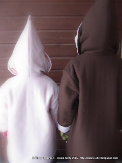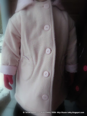 Kankaat ja muut tarvikkeet Eurokangas (vaaleanpunainen ja ruskea fleece, vaaleanpunainen tikkikangas, vaaleanpunaiset ja pinkit napit, ompelulangat), vaaleanpunainen tildakangas kasperiinasta.
