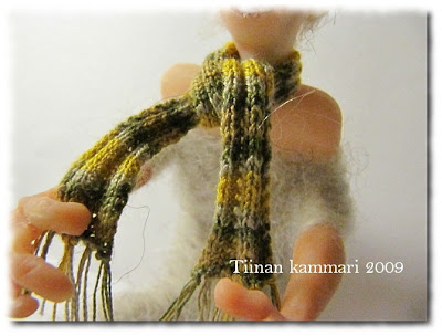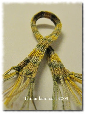 Itse neuloin tämän pienen kaulaliinan 0,5mm puikoilla vennen liukuvärjätystä langasta, jota Sumu-peikko tässä ylpeänä esittelee... :o)