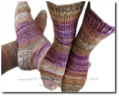 Kärjestä aloitetut sukkaset, tiimalasikantapäällä ja varressa kierretyin silmukoin tehtyä resoria.