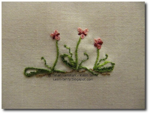 Minä pistelin kukkia kankaalle. Kuvion koko voisi olla näin mutu-tuntumalla ehkä 4x3cm tai jotai sinne päin.