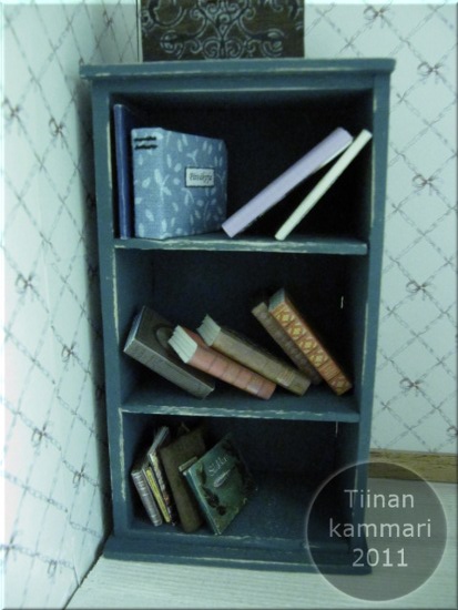 Oli  pakko vähän kokeilla yhteen nurkkaan tätä hyllykköä, jonka tein jo kesällä. En tosin tiedä jääkö se tähän huoneeseen, mutta kuitenkin. Hyllyn täytteenä erilaisia hienoja kirjoja, itsetehtyjä ja saatuja.