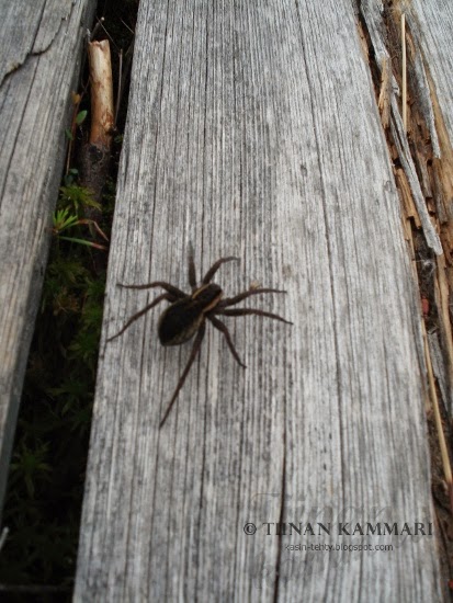 Tapasin pitkospuilla isoimman hämähäkin ikinä, ihan kamala! Hämähäkin peräpää oli peukalon kynnen kokoinen ja pituutta koko tyypillä oli semmonen 3cm + jalat. Kämmenelle sopiva. Onneksi hämppis loikki tiehensä, suolle.