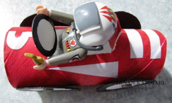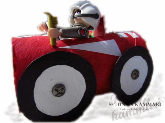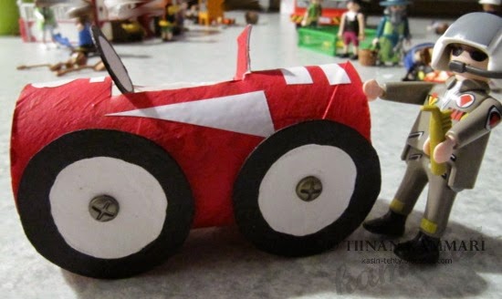 Materiaalina vessapaperirulla, pahvia, haaraniittejä, liimaa, maalia, sakset jne... Simppeliä ja niin cool. Playmobilitkin mahtuu kyytiin vaivatta, eikä ole mennyt vielä edes rikki.