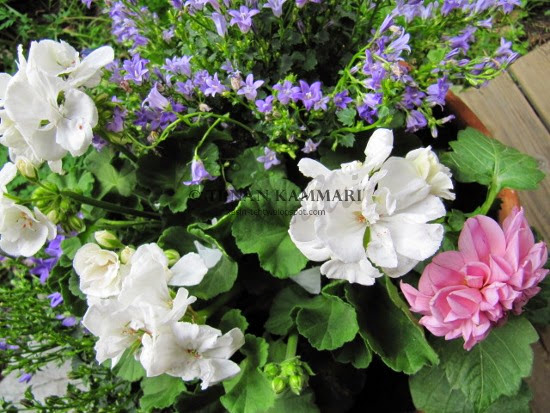 | Ruukun suloisessa sekamelskassa on vielä valkoinen pelarginia ja violetti kellokukka campanula. |