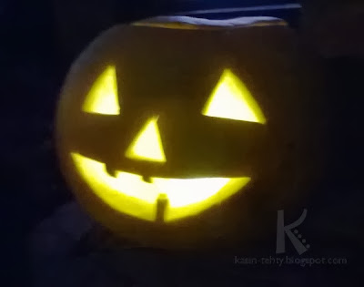 Pienen kurpitsan hedelmälihasta tuli herkullista keittoa. Kuori loihdittiin lyhdyksi lapsen piirtämän mallin mukaan. Isomman kurpitsan kohtalosta kuulette seuraavassa kirjoituksessa.