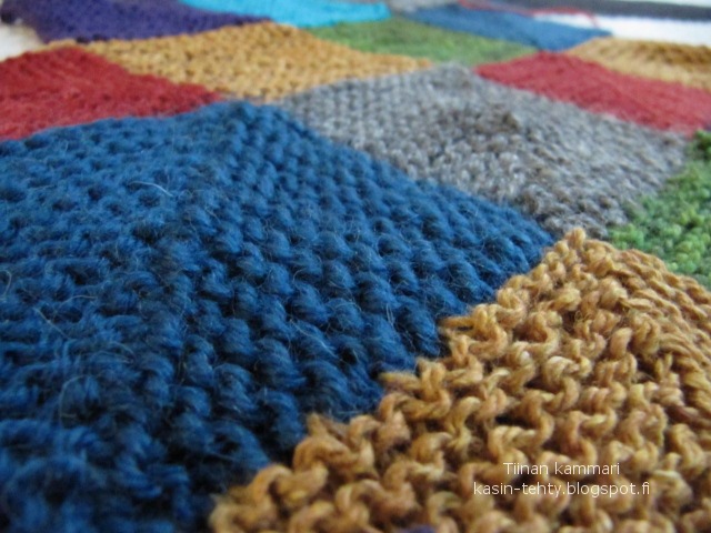 Materiaalina jämälangat, joita on nurkat pullollaan. Lapun koko tässä peitossa on noin 10x10cm.