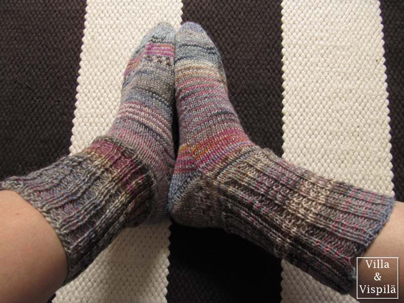 Kivat villasukat, pidän väreistä. Itse en vaan ole uskaltanut tehdä jämälangoista, olen aina ajatellut että ne pitää olla molemmat sukat täsmälleen saman väriset. Onko varsissa joku kaksivärinen lanka perusvärinä?