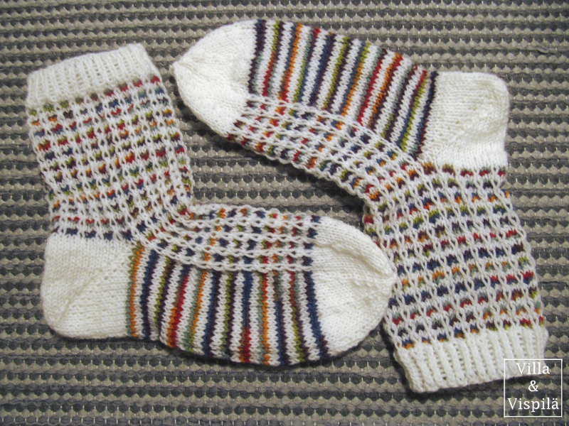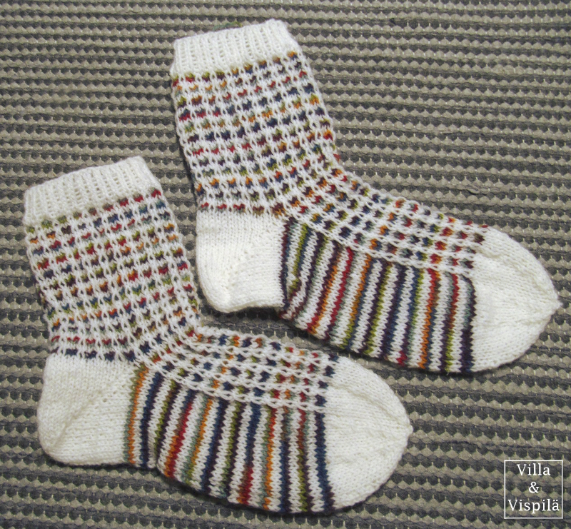 Näihin sukkiin olen käyttänyt Novitan Nallelankaa kahdessa eri värissä, yksivärinen valkoinen ja valmiiksi raidoitettu kirjava.