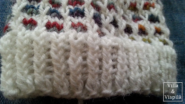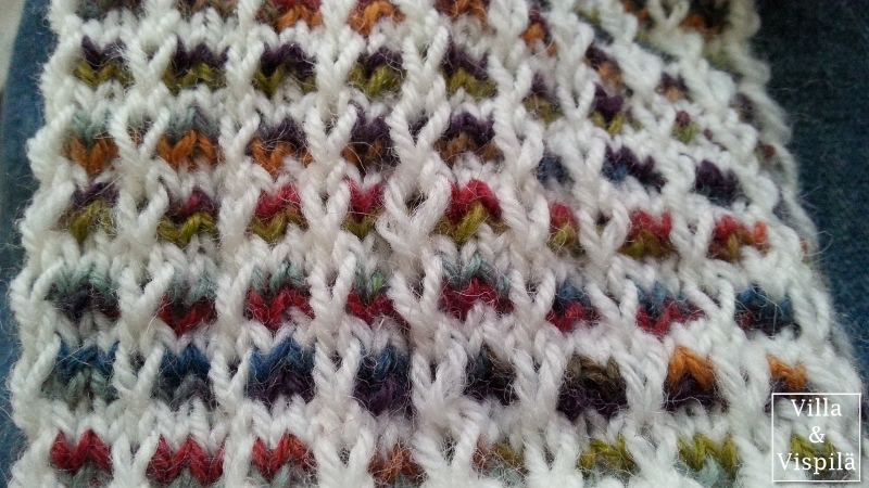 | 3. krs - Kirjava lanka, neulo 2o, nosta 1s neulomatta, toista kerroksen loppuun asti. 4. krs - toista 3.krs. Koko mallikuvio syntyy toistaen 1.-4.krs. |