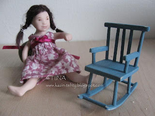 When I was a little girl, my father made me lovely blue rocking chair. Laiter he repaird that rocking chair to my own children. I made this little blue rocking chair in scale 1:12 to my dollhouse.